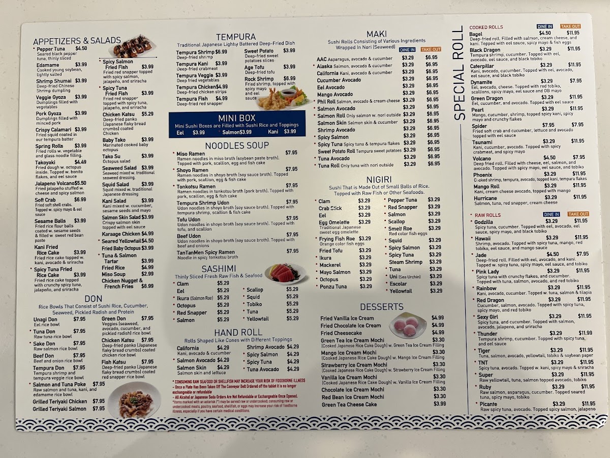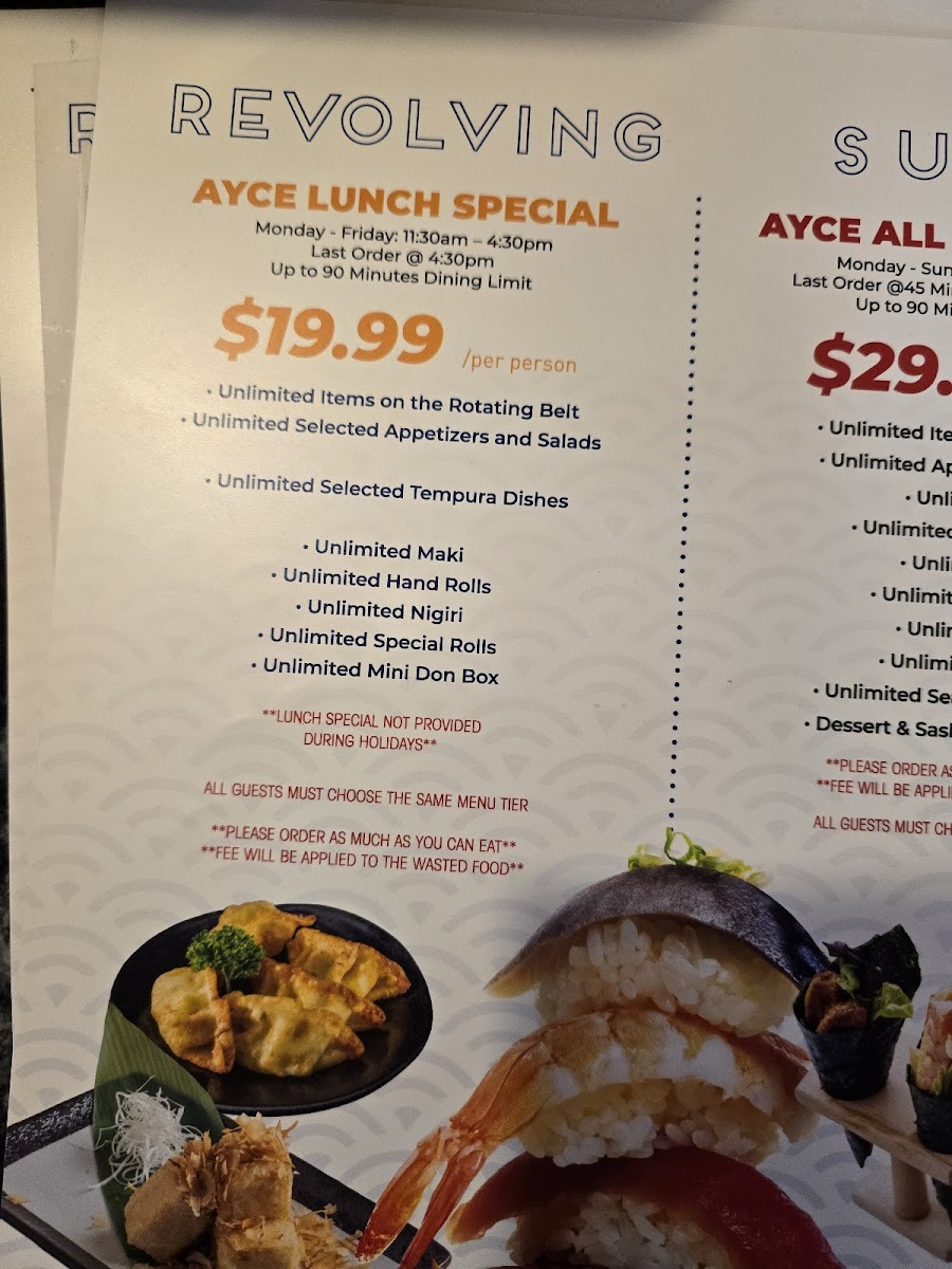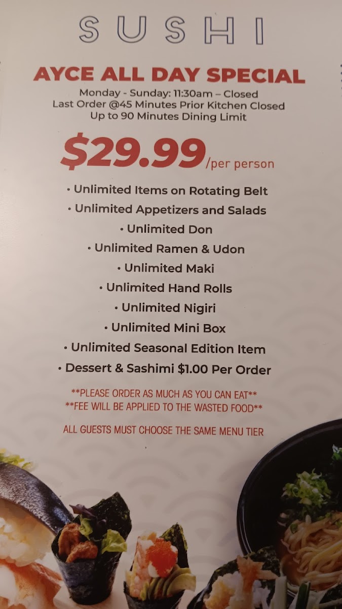 Drinks like hot tea and refreshing iced options round out the menu, offering warmth and balance alongside the fresh seafood and savory dishes. The overall experience encourages a comfortable pace where diners can savor each bite as plates glide by, making it an enjoyable spot to discover new favorites or stick with trusted classics.